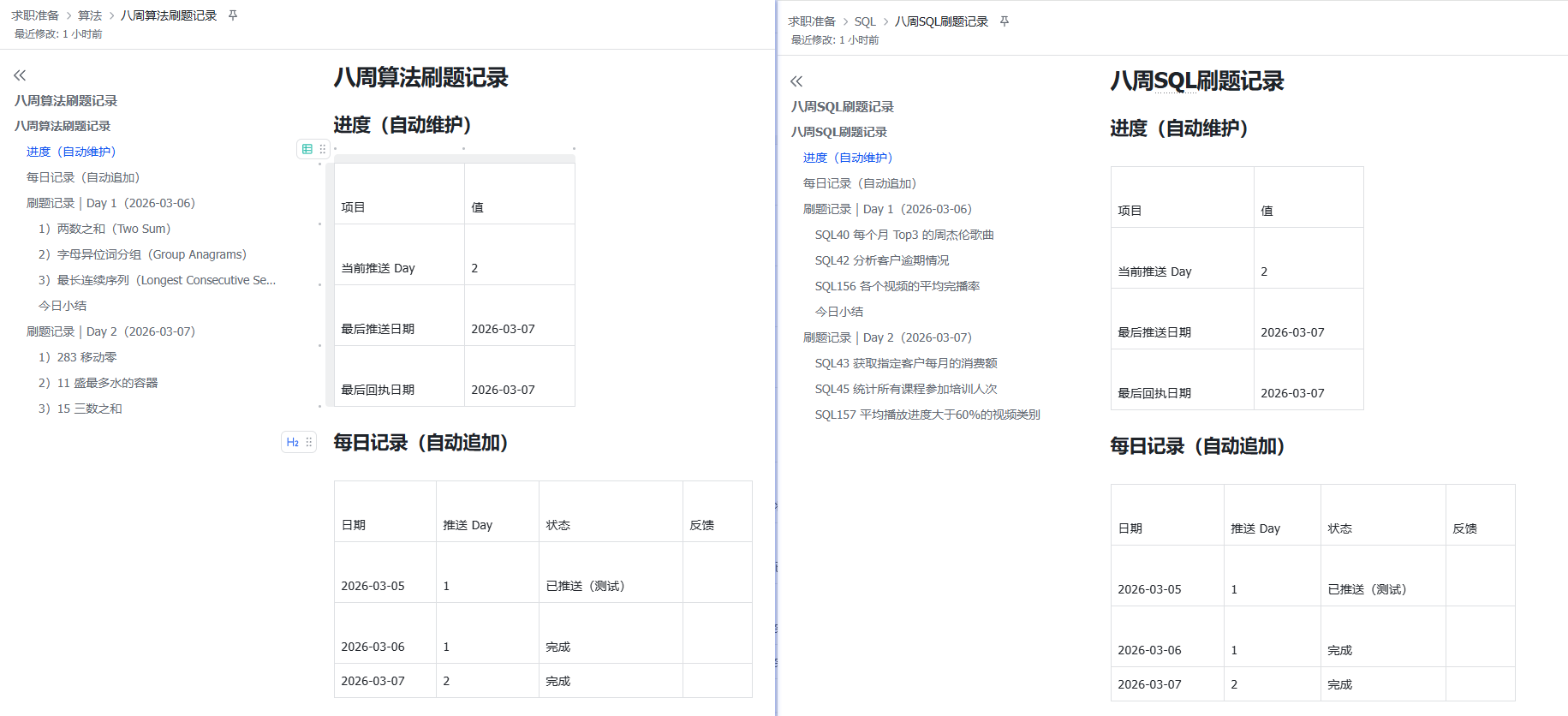 “把内容分别记录进算法刷题记录 / SQL 刷题记录中”