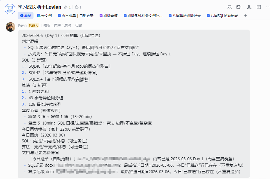 发现一个很现实的问题: 即使每天都推送,如果我没置顶,过几天就得翻聊天记录找“今天做什么”。