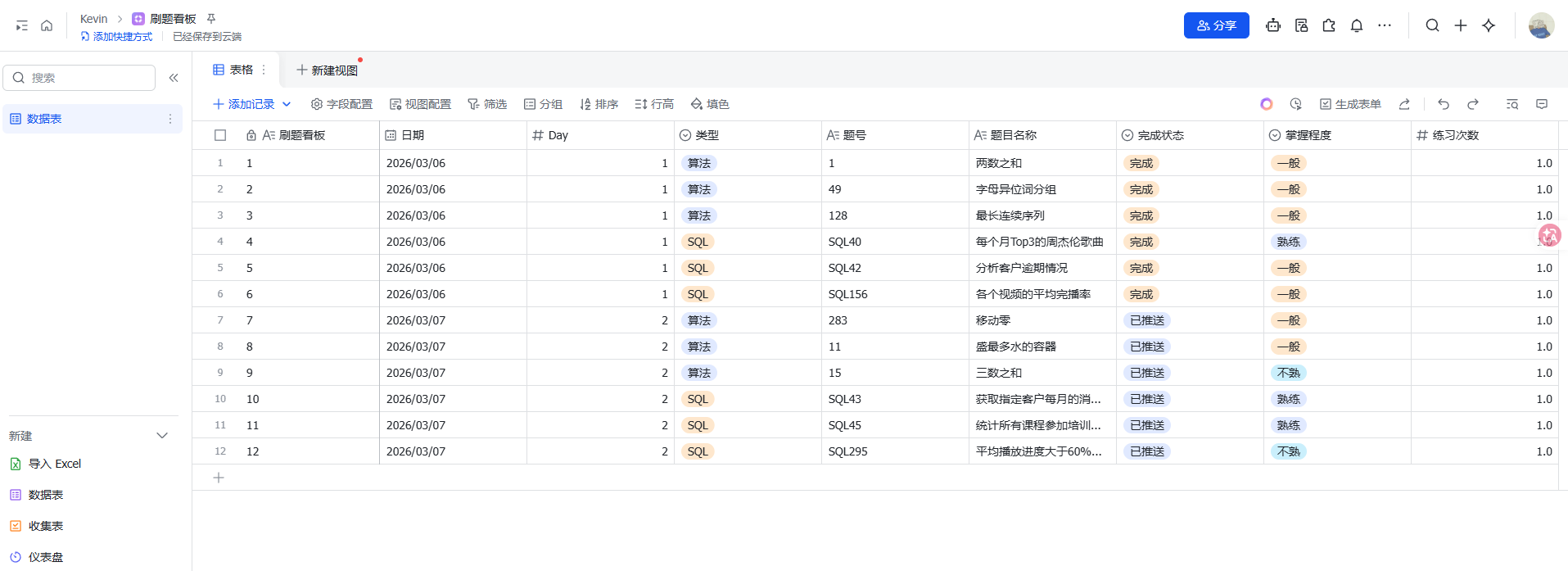 刷题看板(Bitable):每题一行,记录状态、掌握程度、练习次数
