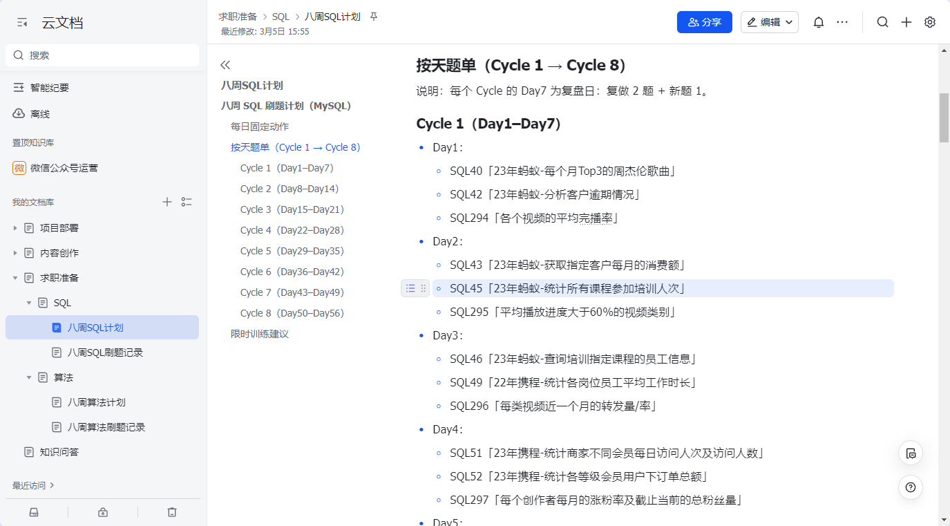 算法、SQL 计划:改成 Cycle 写法(每 7 天一个周期),每天列 3 道题(题号 + 题名)。