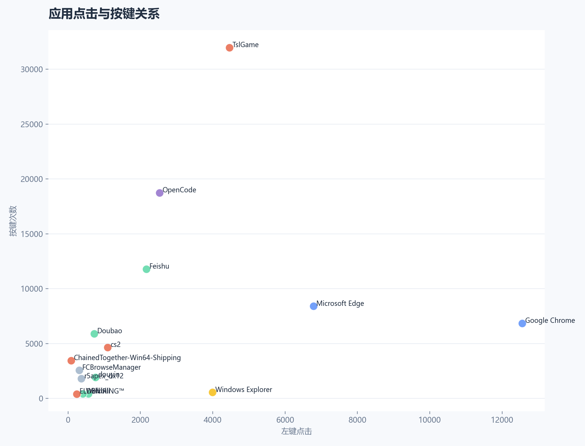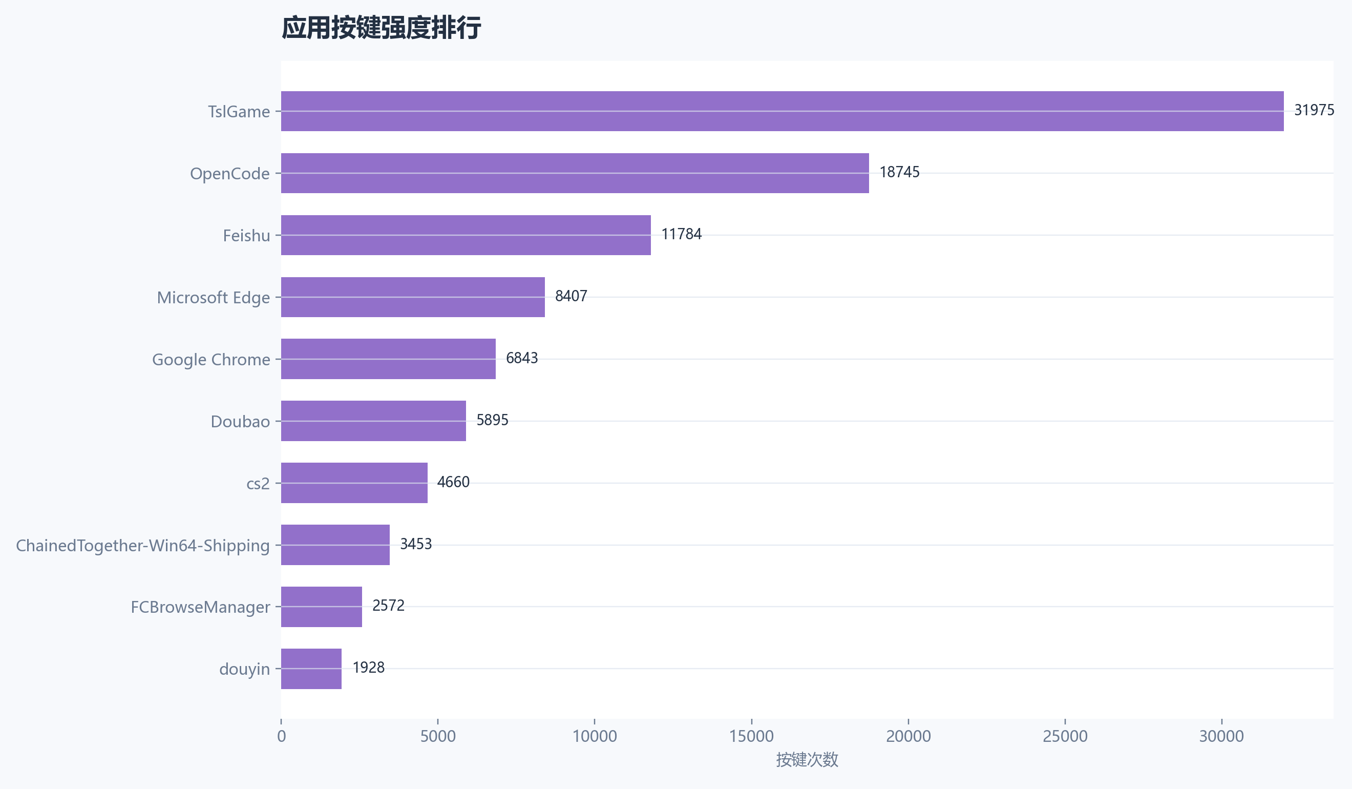 前 3 个应用贡献了 61.57% 的总按键,前 3 个点击应用贡献了 51.34% 的总左键。这说明整体使用并不分散,而是高度集中在少数核心场景中。