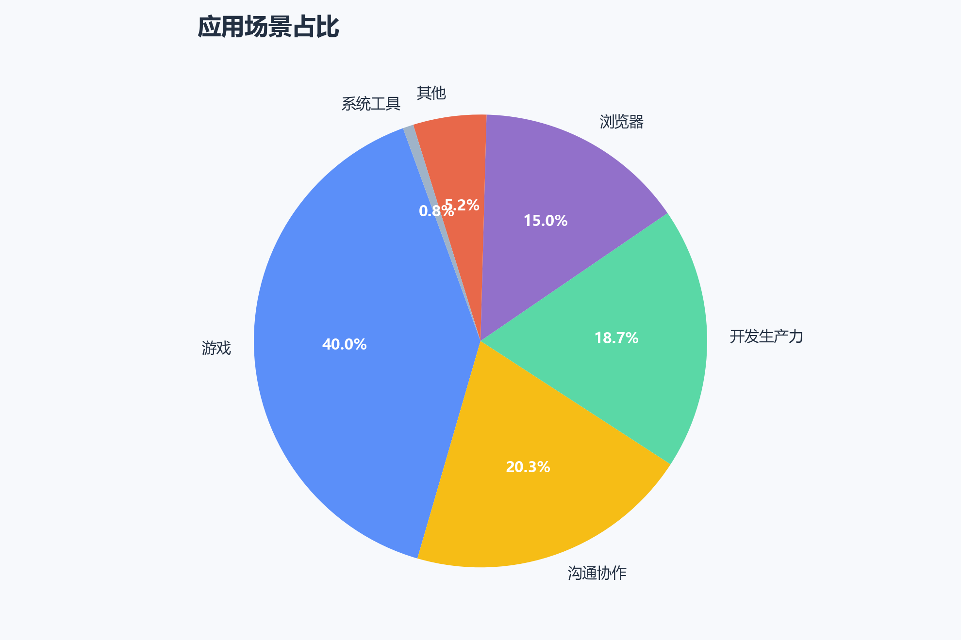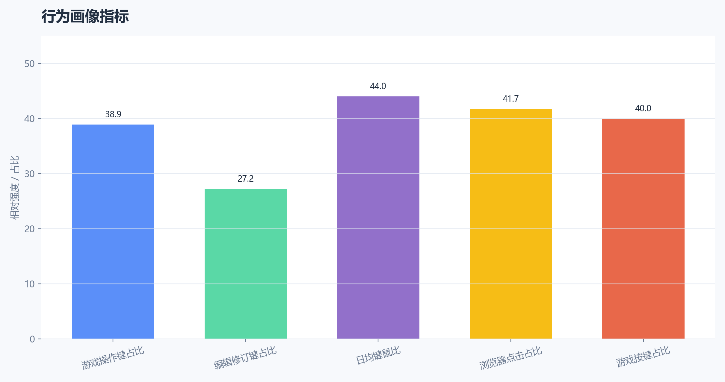 鼠标使用方面,并不是单纯的“跟着键盘走”,而是存在大量主动点击和页面交互。浏览器类应用贡献了大部分滚动和相当比例的点击,这通常意味着搜索、阅读、切换页面和筛选内容的投入较多。与此同时,游戏和工具类应用又拉高了操作密度,因此整体呈现出很强的键鼠并重特征。
