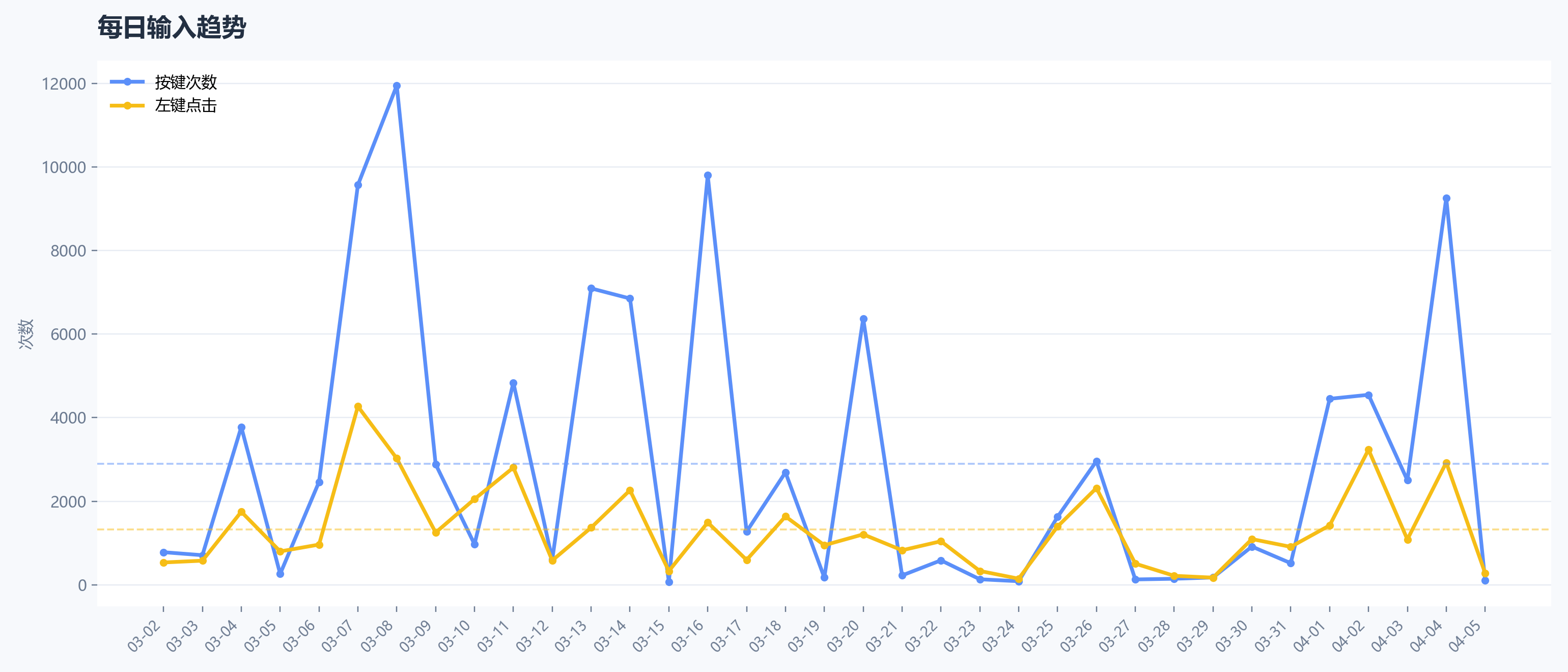 从趋势上看,输入行为并不是均匀分布,而是存在明显的高峰日。按键和点击经常同步抬升,说明高活跃日通常不是单纯浏览,而更接近“边操作边输入”的综合重度使用。