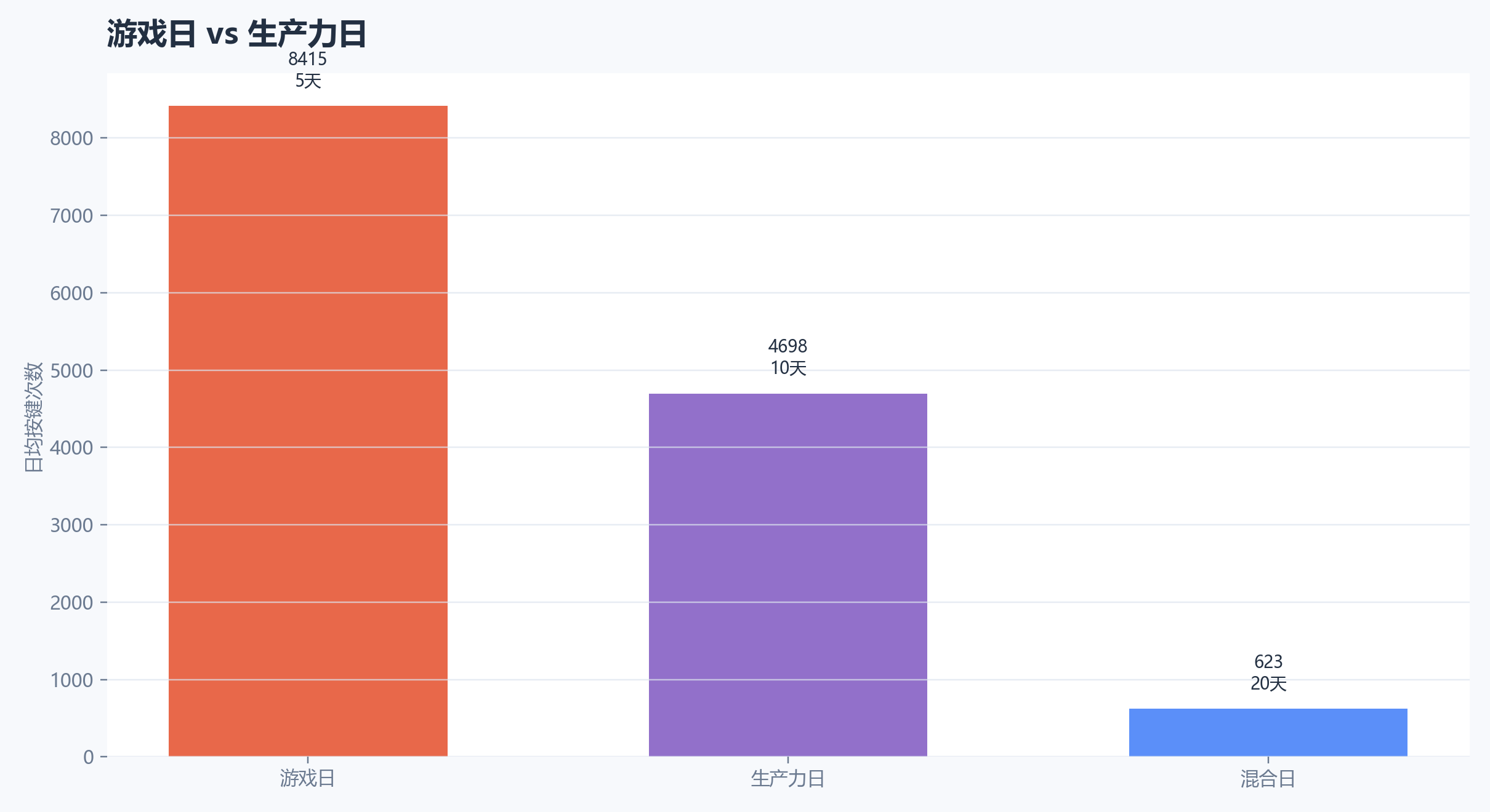自动识别规则基于每日应用按键结构:游戏输入显著占优时标记为“游戏日”,开发生产力与沟通协作输入显著占优时标记为“生产力日”,其余则归为“混合日”或“普通日”。