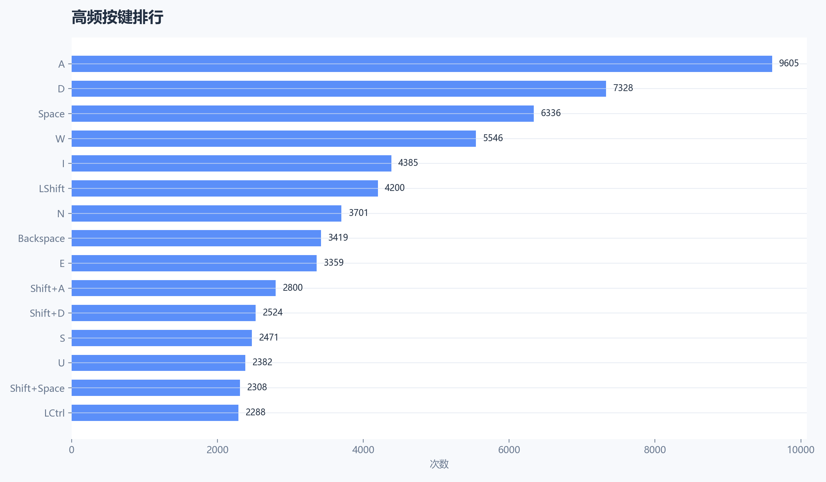 W/A/S/D、Shift、Space这类按键占比不低,明显偏向游戏和高频交互场景。另一方面