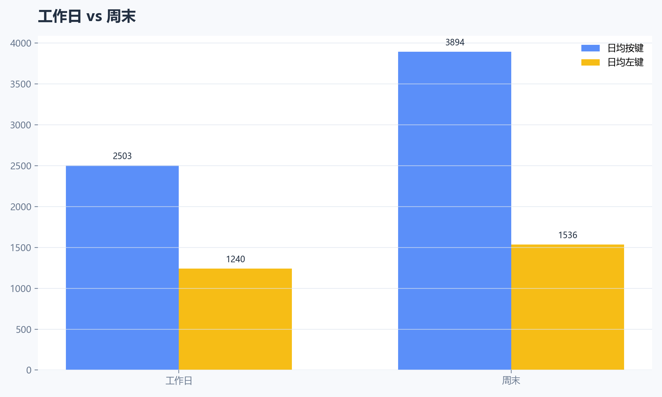 周末: 共 10 天,日均按键 3894.1,日均左键 1535.6,日均滚动 2286.9 px,日均鼠标移动 368.39 m