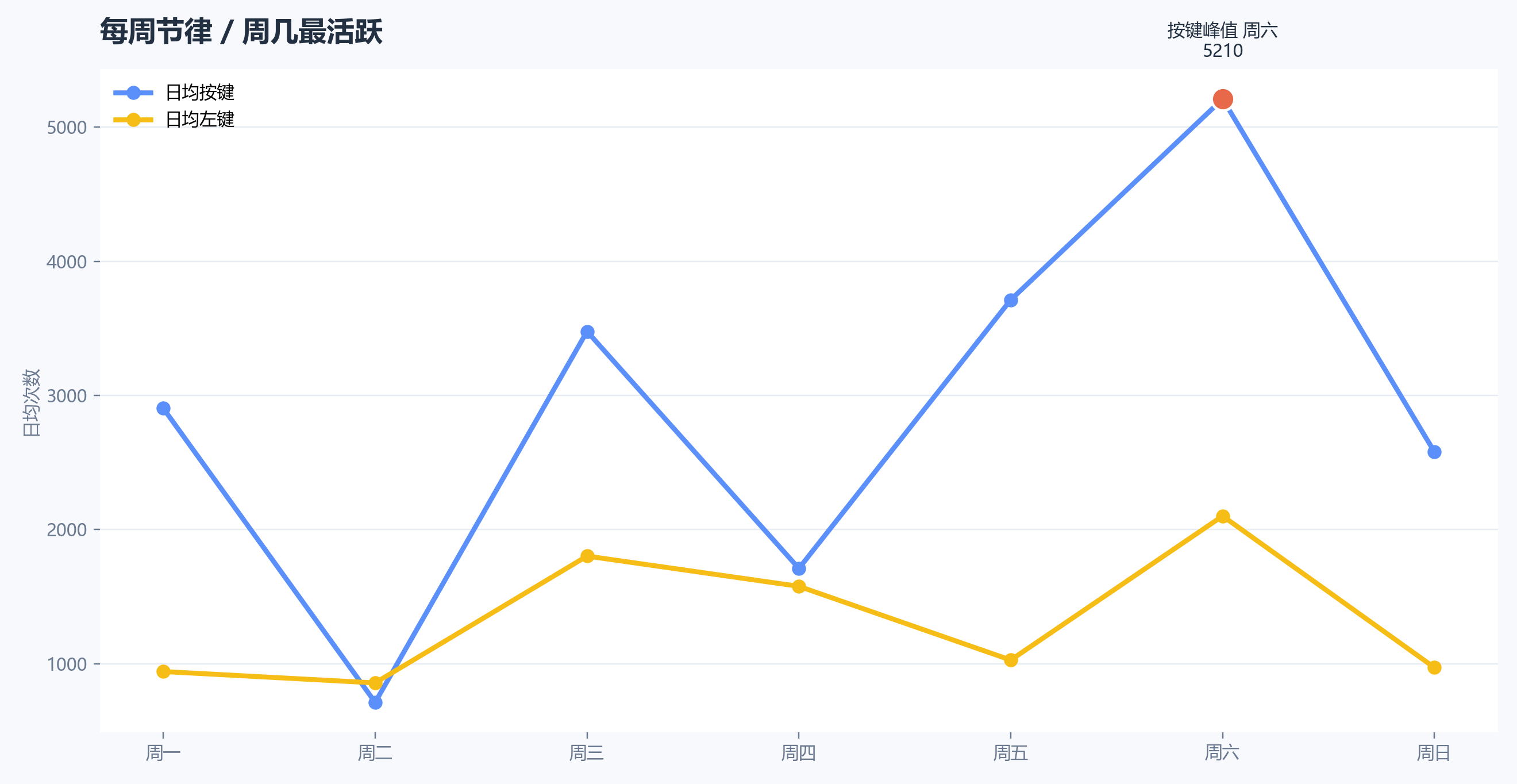按键最活跃的星期: 周六 该日均按键: 5210.0 该日均左键: 2100.8
