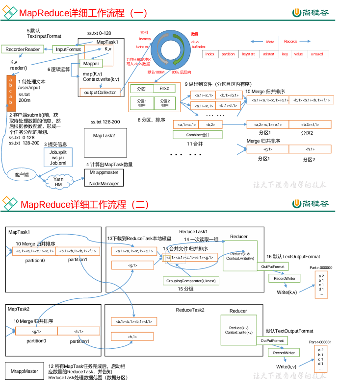 Shuffle 是 MapReduce 中 连接 Map 阶段与 Reduce 阶段 的核心过程,负责将 Map 端的输出结果分发到对应的 Reduce 节点。整个过程可分为以下几个阶段: