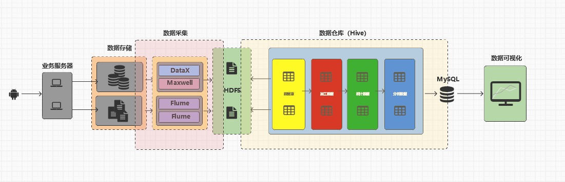 数据产生 → 采集与存储 → 数据仓库 → 数据服务 → 可视化呈现