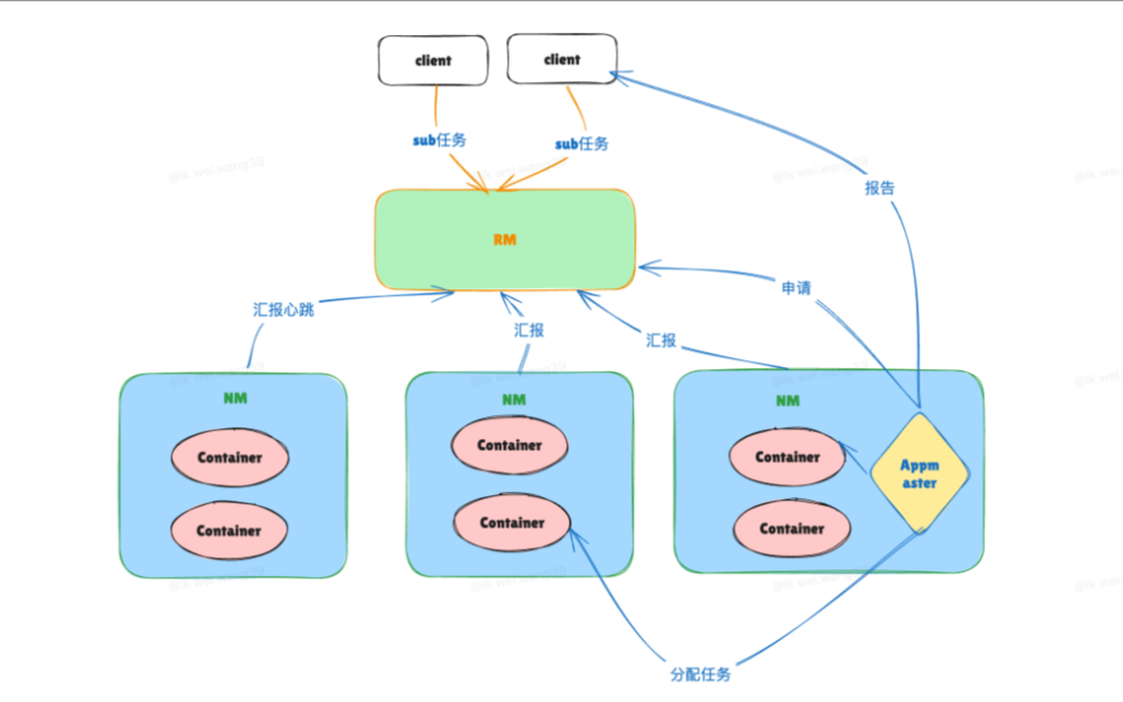 客户端 → RM → AM → RM → NM → Container → 执行任务